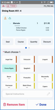 After selecting all appropriate modifiers, tap Done to add the item to the ticket. Or, if necessary, you can remove the item and return the order screen by tapping Remove Item.