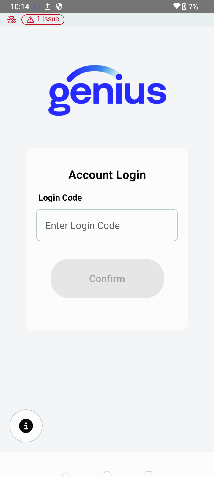 The Genius for Restaurants POS app will run and prompt you for an Account Login Code. - Enter a valid Account Login Code, then tap Confirm.
