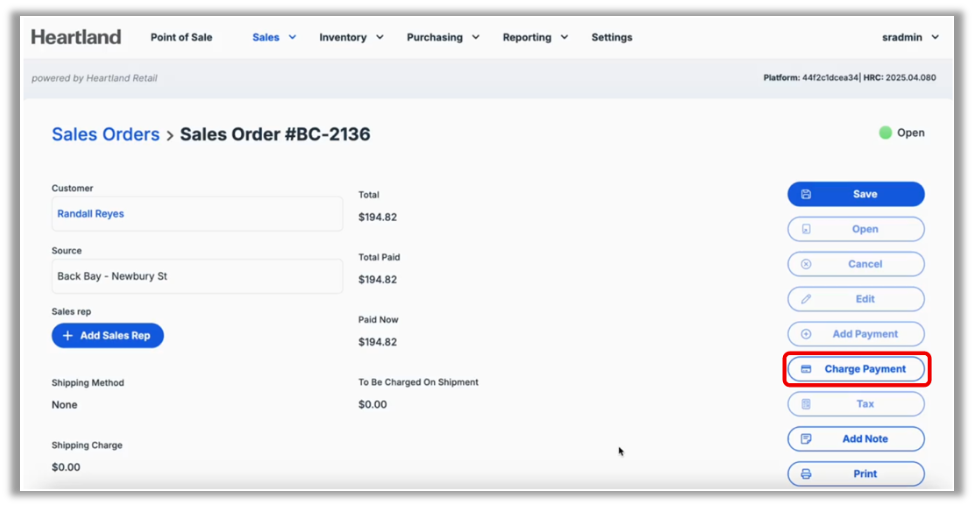 In this section, we will demonstrate the updated flow for sales orders when using Heartland Retail for fulfillment.