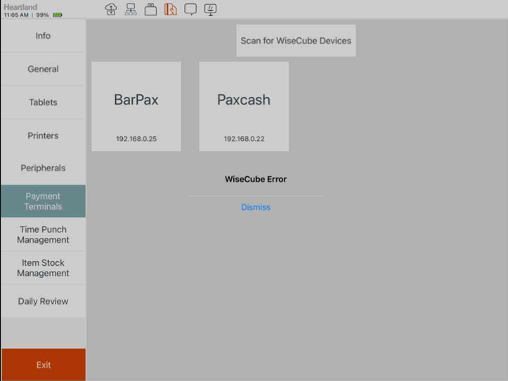 The POS will display a list of tiles, each representing an available payment terminal. - Tap Scan for WiseCube Devices.