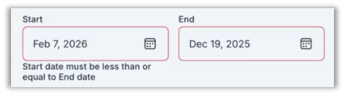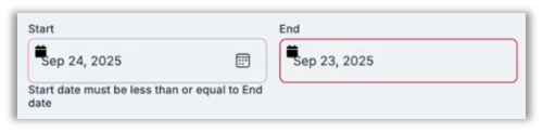 In previous versions, if you selected an invalid date range (for example, if the selected end date preceded the start date), two calendar icons (the custom-designed calendar icon and the browser's native calendar icon) would display, creating visual clutter and layout inconsistency. With this release, the system displays only the custom-designed calendar, regardless of date selections.