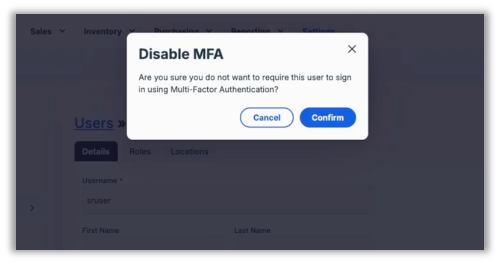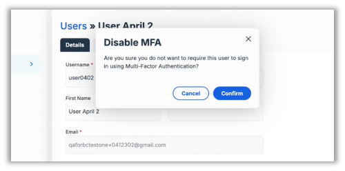 In previous versions, the confirmation modal that appears when disabling multi-factor authentication did not mask the background as it should. With this release, the background is masked as expected when the prompt displays, consistent with standard modal behavior across the application.